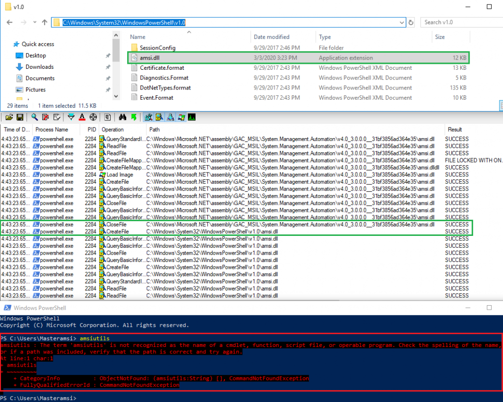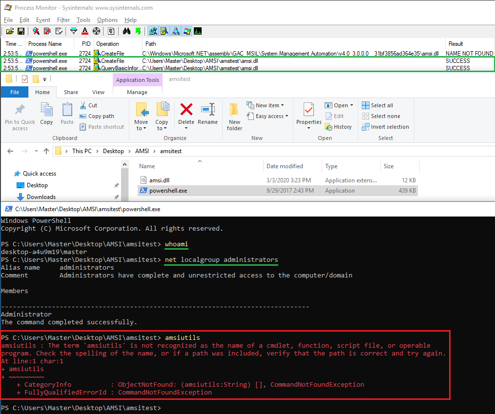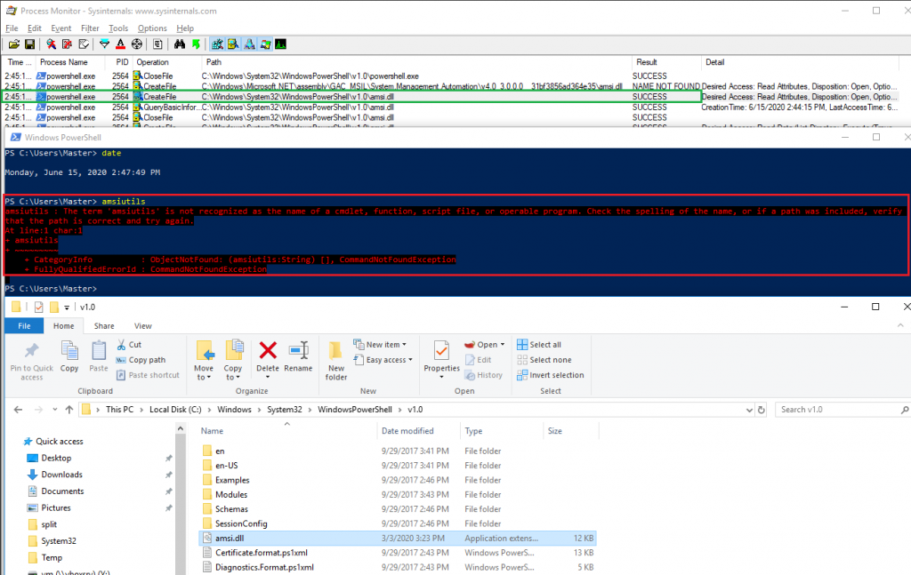 Even better, based on the DLL search order, PowerShell tries to load the AMSI DLL from the directory from which the application was loaded. This means as a low-privileged user, bypassing AMSI is therefore just a matter of copying the PowerShell executable and the AMSI DLL to a user-writable folder.