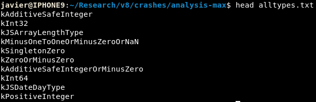 MinusZero, ignoring node 120.As we have access to the source code it is possible to both modify and debug the code. In my case, I added some printf calls in order to output the calculated min and max values on screen. This was a minimal change that required little effort; however, I also wanted to check what the types of rhs and lhs were at different stages, just to confirm my assumptions of the type confusion. To do this I first gathered all the types in the type-cache.h file: