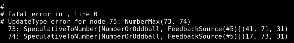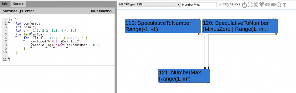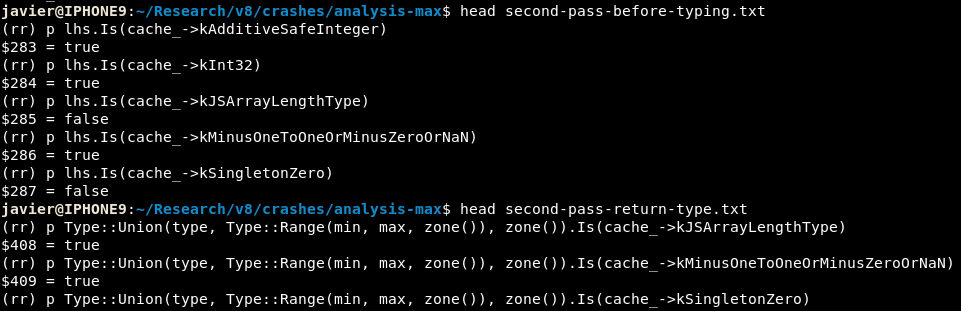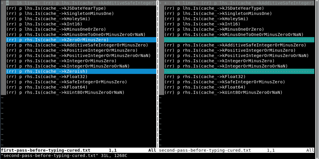 As we can see in the vim diff, ZeroOrMinusZero and the Zeroish types are not in the second NumberMax pass. By itself, this analysis might or might not mean that something is wrong with the types, but it’s a way to correlate with source code analysis and turbolizer that a type has been lost.