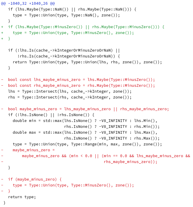 As we can see, this is a much more elegant and simple solution, removing all the complexities at a later stage, although the idea is still the same. If the type of any of the right or left hand side operands are MinusZero then perform a Union with the type variable, as this one will be returned and union’d with the Range type below. But why did I choose a Union for each of the lhs and rhs variables? The answer is in the range calculation lines: