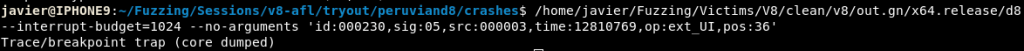 I was determined to use Fuzzilli, but Fuzzilli relied on patching v8 to convert it into “fuzzable” software, however, a patch for the latest v8 wasn’t available at the time. So, I needed to implement a patch for the latest commit, for which I recently did a Pull Request for the v8 patch here (After this research, the patch and some other bits made it into v8’s code base, so now the only thing that’s needed is to use v8_fuzzilli when generating the build files on the v8 project). The parts of the initial patch were mostly unchanged, the only thing that was needed was to understand the changes on the relevant v8 files and update the Fuzzilli logic accordingly with some added bits that we’ll see later. In any case, all credit goes to Samuel Groß for the initial patch and open-sourcing Fuzzilli!