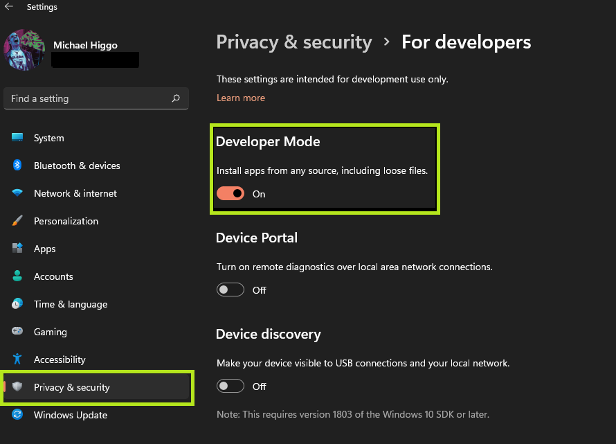 Next, Open your Windows settings and enable Developer Mode within Windows itself, as opposed to within WSA (although both are needed). This will allow you to install third party application bundles from outside of the Microsoft Store.