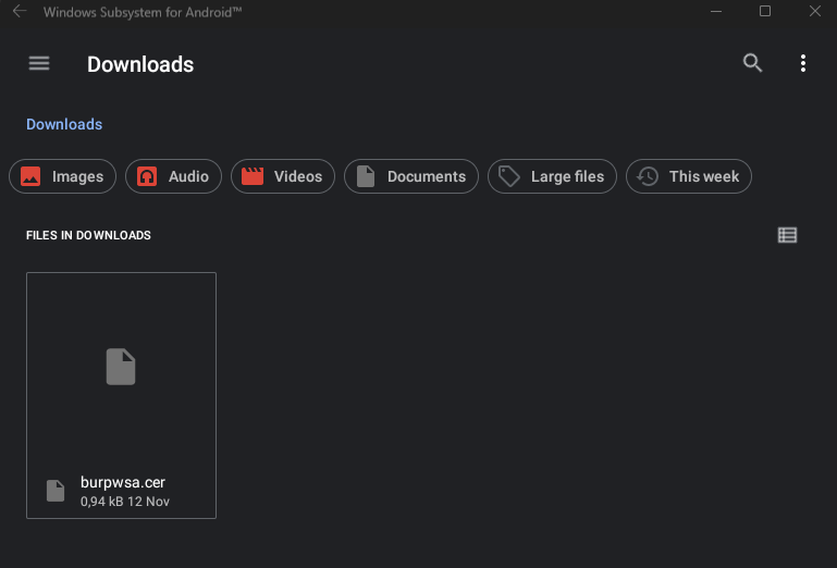 I knew I had access to all folders after rooting with Magisk, but the Downloads folder was visible within the files application of WSA itself, so I selected this as the destination directory.