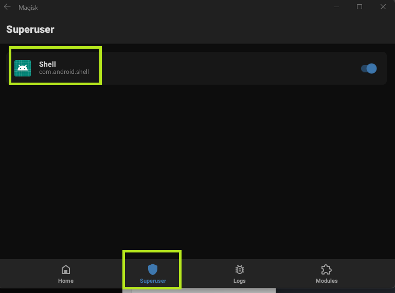 Typing su to become root will result in a pop-up within Magisk, asking to allow root access. Once allowed, the SuperUser tab within Magisk will show that we have granted root access within the ADB shell.