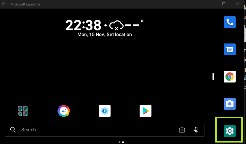 After trying multiple launchers, third party settings applications, and Windows specific proxy applications, I had the idea that the launcher with the highest probability of being compatible was the Microsoft Launcher. You can install it directly onto the device by using OpenGapps and using the official play store link. I opted to side load the APK from here (however multiple other APK mirroring sites exist, so use your preferred one), and installed it with adb install. This gave me exactly what I was looking for, a settings application.