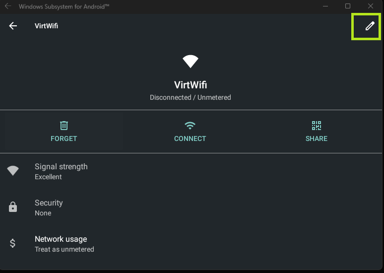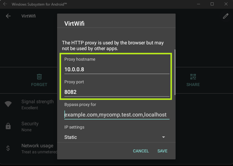 Within the VirtWifi I edited the proxy to have the same settings.