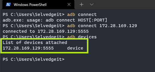 We can connect to this “device” using ADB connect `IP`. We can then re-list the devices and confirm we have connectivity.