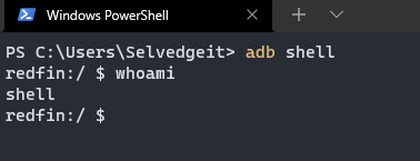 In the terminal, type ADB shell to gain access to the WSA “device”. We can confirm the current user with whoami.