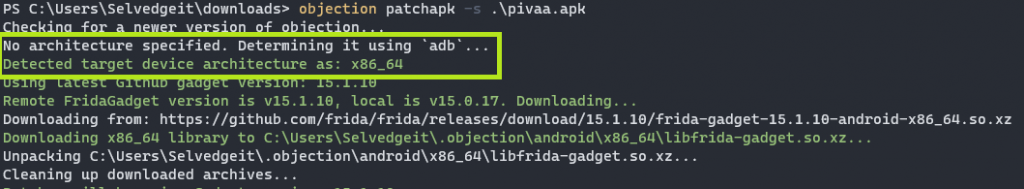 Objection works in much the same way from this point. Simply running objection patchapk -s 'sourceapk' will allow ADB to determine the device architecture the same way as it would from a mobile device via USB. I will be using the “Purposefully Insecure and Vulnerable Android Application” (PIVAA) for demonstration purposes.