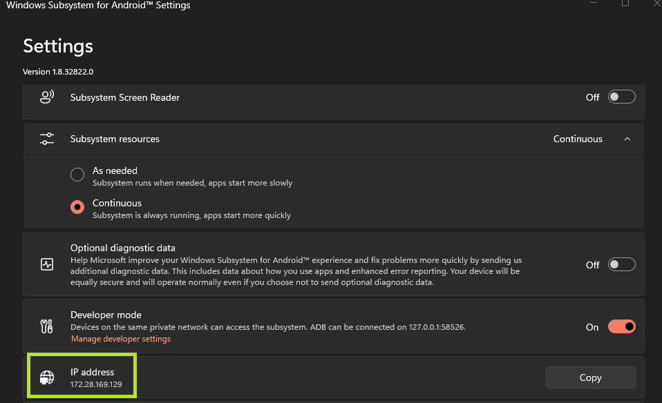 The second option is not personal preference. You MUST enable developer mode within WSA, or you will not be able to connect via the Android Debug Bridge or ADB.