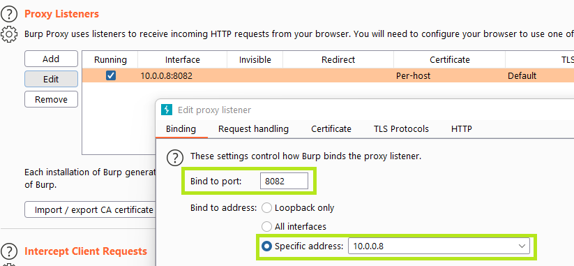 Once installed, I set my proxy listener in Burp to that of my host Ethernet IP, and a port of my choosing as per usual.