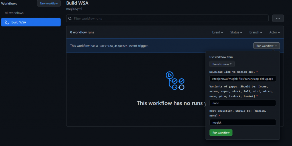 Once forked, click Actions, and click on the Build WSA workflow, specifying the OpenGApps version you selected from above. In summary, the workflow will: