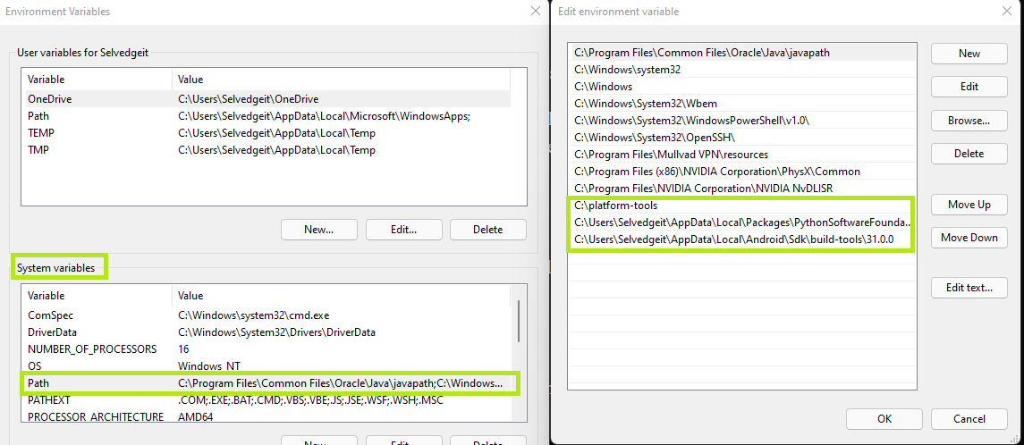 On my system, I added the paths to all of the above-mentioned tools to my Windows environment variables so that they can be run from any directory. I recommend this for a smoother experience. It can be done by clicking Start, and then typing environmental variables, and editing the system-wide variables.