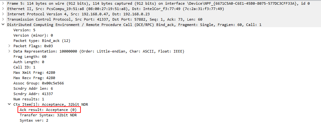 The second packet is the reply from the RPC server which says that the binding was accepted: