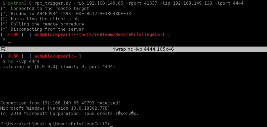 Since I have Full Control rights on this binary I can just replace it with my backdoored RPC server, reboot the server and realize that the backdoored RPC interface is reachable: