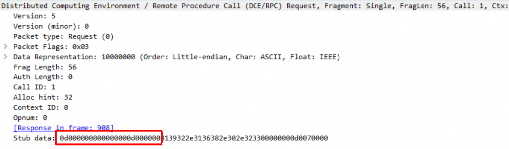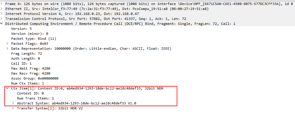 Next we can see four packets in purple. These packets constitute the DCERPC binding operations and RPC calls. Taking a closer look at the payloads, you can the the first packet tries to bind to a context_item which is composed of a UUID and the version of the interface: