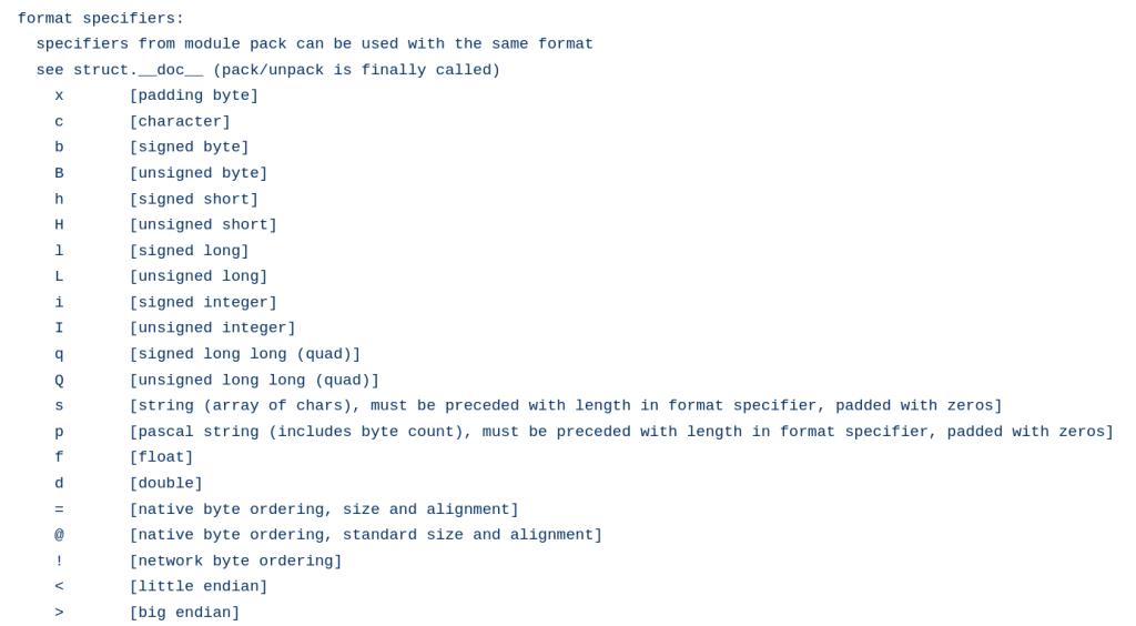 I found out later that it was the NDR headers which I wasn’t using correctly and caused the RPC call to fail. Using the NDRCALL class from Impacket removes that issue as the NDR header is automatically generated. As for the data stub, to reproduce the marshalling operation we will use the struct library from python and base our work on the Structure class from Impacket which you can find in the following file. All we need to do to implement this is to create a class that inherits the NDRCALL class and fill in the structure list: