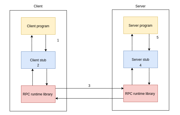 - 4. The server stub deserialises the data and forwards it to the server code.