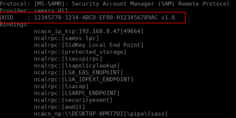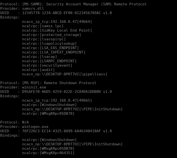 If you want to list which interfaces are exposed you can use the rpcdump.py script from the Impacket library. The script will connect to port 135 (where the epmapper is listening) and list all of the interfaces exposed. The following screenshot is an extract of the output of the script where three interfaces are described: