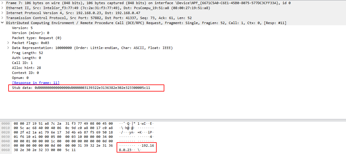 The binding process will create a logical connection between the RPC client and the RPC server and will result in the creation of a binding handle. Using this logical connection we will be able to send the data and receive the result. Below you will find a capture of the network traffic sent between the RPC client and the RPC server when connecting: