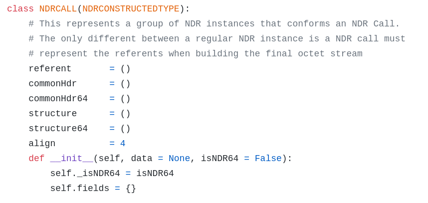 Basically the code creates a string binding. Then, it connects to the remote endpoint and binds to the interface. At this point the only remaining thing we need to do is to send the parameters to the RPC interface in the correct format, packed. Since we don’t have a client stub that will marshal the data following the NDR format for us we will have to implement it ourself. This can be done using two Classes from the Impacket project. The first one is NDRCALL which you can find in the following file. The NDRCALL structure is the following: