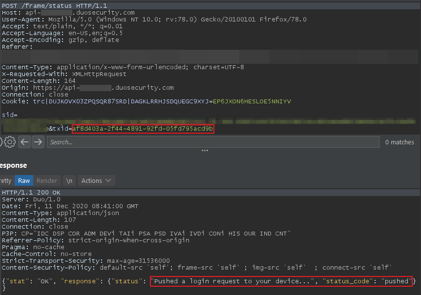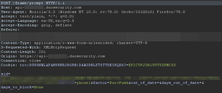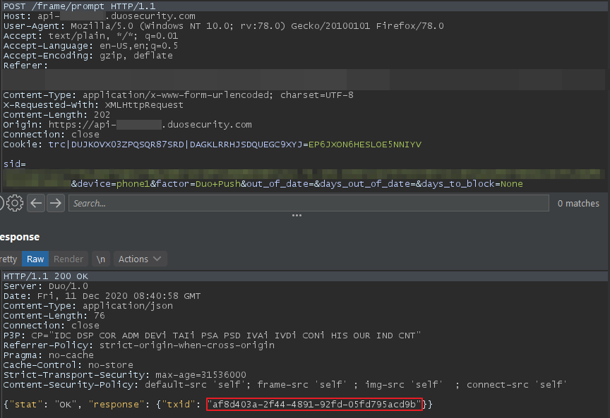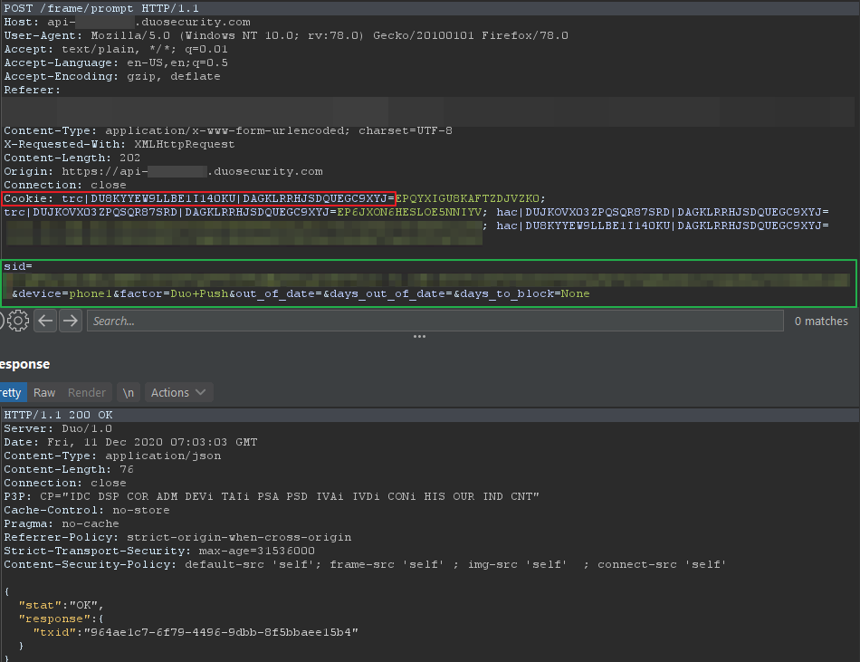 While having a closer look at the generated HTTP traffic in Burp, I decided to give Duo another look. We had extra application accounts which we could use for testing, which is important as you’d see shortly. During a typical authentication flow, a user would eventually trigger a two-factor authentication verification that is sent to a Duo endpoint via a POST request, e.g. below: