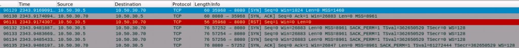 As we can see from the above wireshark output a SYN scan receives the SYN, ACK response from the server, which it interprets as the port is open. Next a RST is sent to close the connection. A closed port will differ in that it receives a RST flag from the server, indicating the port is available and not blocked by a firewall, but there is no service running on that port.