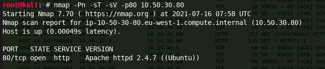 Now that we have identified that a port is open, we may wish to see more information about the services listening on those ports – we can do this with the version detection (-sV) flag. This scan mode is much slower and creates a lot more traffic as it probes remote services, so be aware of that. Often it makes more sense to only use that against the ports that you already know are open. Due to the probing nature of this scan type, it is also highly likely to be seen by a blue team or other network monitoring software.