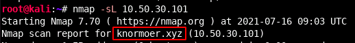 This helps us to reduce our scope from a full /24 (255 hosts) to a handful of hosts. By sending ICMP packets, we can assume a host is up if it responds with an echo reply. This is clearly useful, however if we are interested in being stealthy we may not want to send any packets on the network. Additionally, what would happen if ICMP was blocked? Well in this case we could consider doing a list scan. By using the -sL flag we could list the hosts in a provided network without sending any packets on the network. By itself that is not really useful, however, this scan type will by default do a reverse DNS lookup which can help us identify computers on the network (and often their use) just by their name.