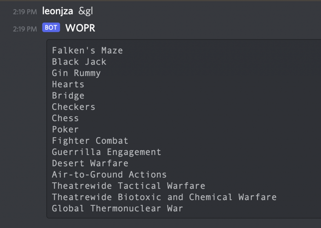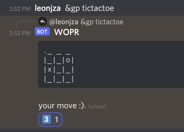 Once killed, you earned a “dead” role. Having this role meant that you could no longer use any challenge commands (ie. commands starting with an &). The only way to come back was to have the human’s score be more than the WOPR score, pushing the DEFCON level back to level 5. At level 5, the bot would concede and “revive” all dead players. This mechanic encouraged some group work to get others to play tictactoe to win again :D