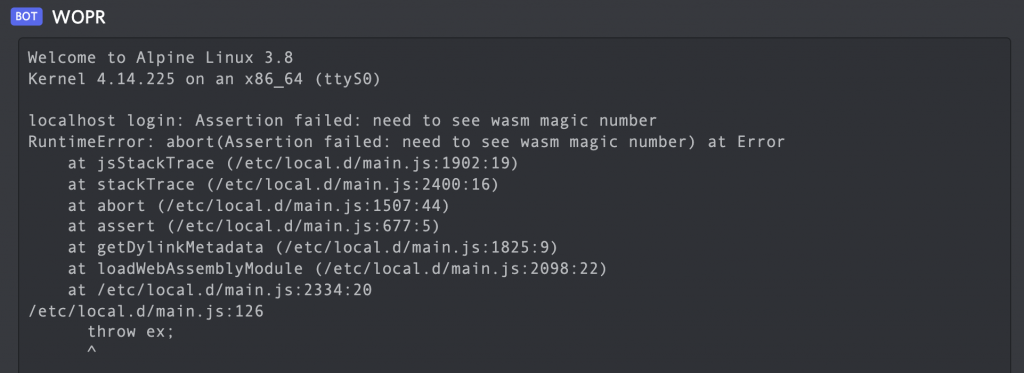 Behind the scenes, a Firecracker MicroVM is booted and the player’s uploaded file mounted in and its console output streamed to Discord.