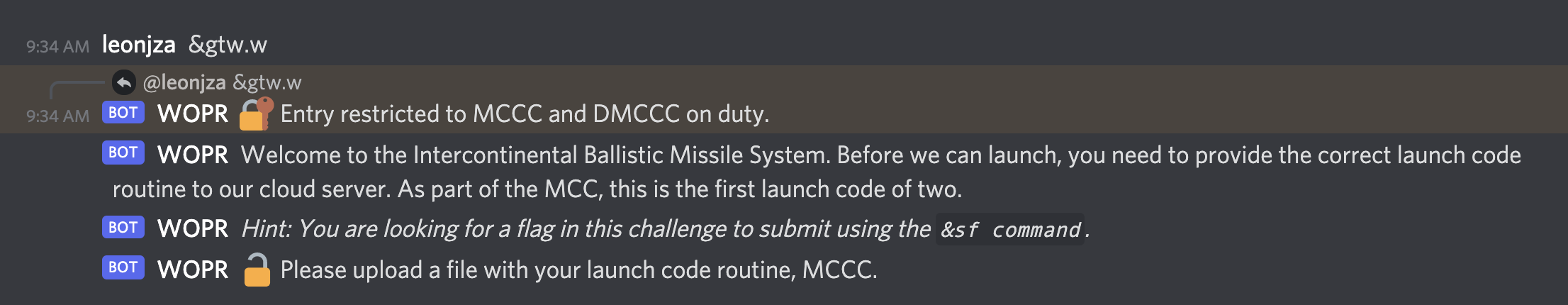 To start the challenge, you would message the bot >w.w, whereafter it would ask for a “launch code”.