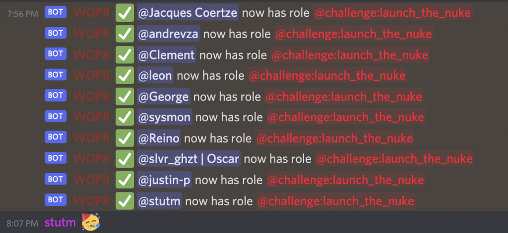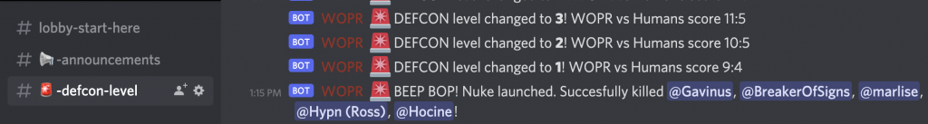 The bot would win in two conditions – either the game times out, or you actually lost as a human. The bot would announce each DEFCON level change in a channel, and when it reached DEFCON level 1, it would start launching nukes, killing members.