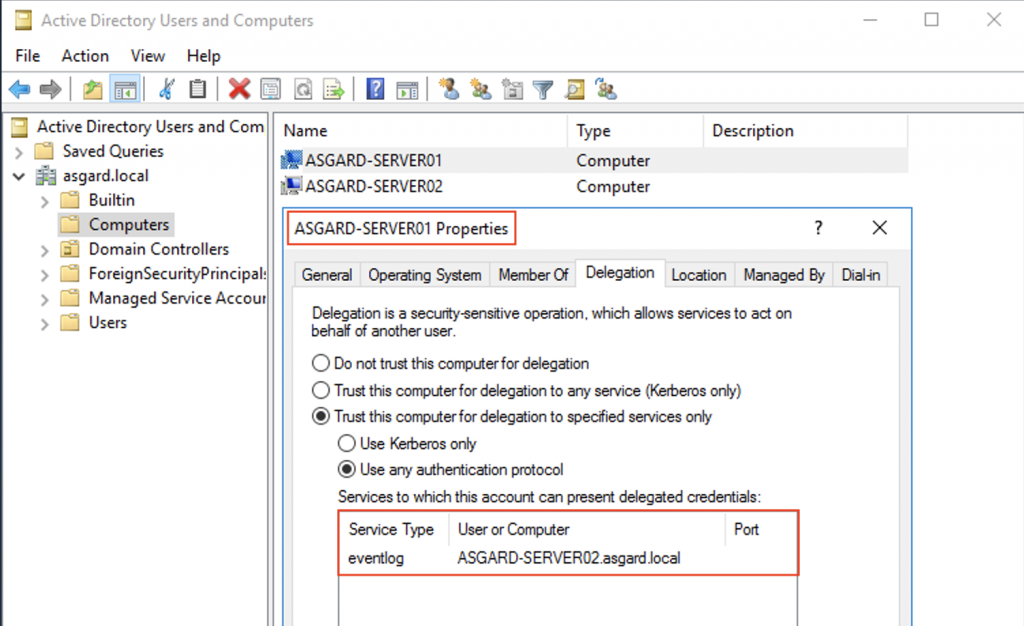 As shown below, the ASGARD-SERVER01 has been configured to present delegated credentials to the eventlog service of ASGARD-SERVER02.