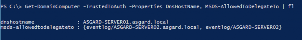 Get-DomainComputer -TrustedToAuth -Properties DnsHostName, MSDS-AllowedToDelegateTo