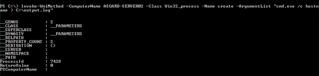 We can then use Invoke-WmiMethod within PowerShell to execute a command on the remote host via WMI: