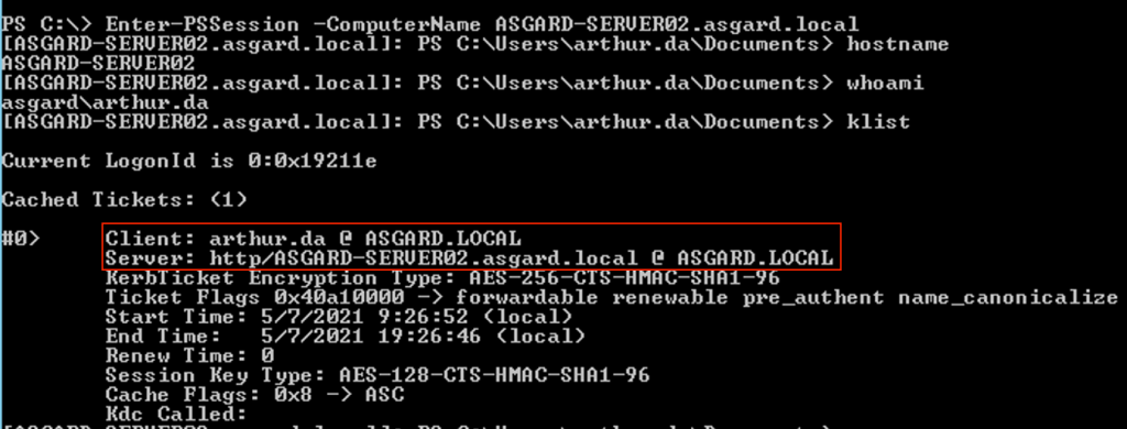 If we connect to ASGARD-SERVER02 using Enter-PSSession we’ll be able to execute commands remotely. If we execute klist on the target host, we’ll notice that the HTTP service ticket is available there as well:
