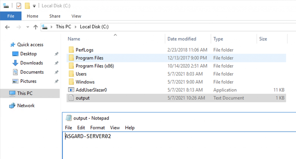Similarly, we can also use wmic. Note that although wmic does not return any output, we can execute commands remotely such as executing a binary. For the purposes of this blogpost, the PoC is merely the creation of a TXT file on disk, to show that the command has been executed successfully.