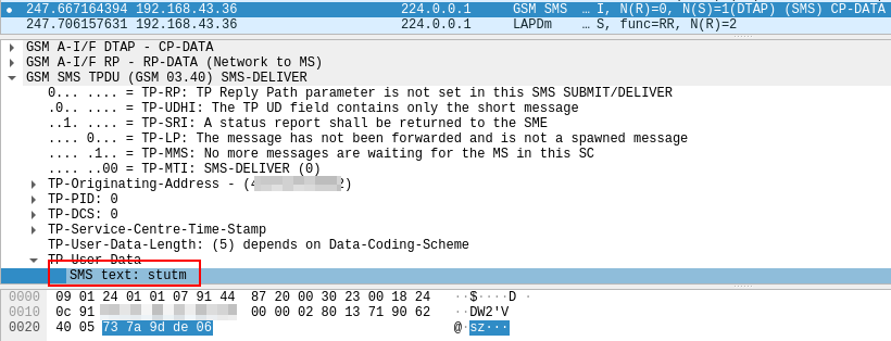 - Octet: C8329BFD064DCBEE7919FA9ED301, TP Field: TP-UD, Reference: User Data (Hello SensePost)