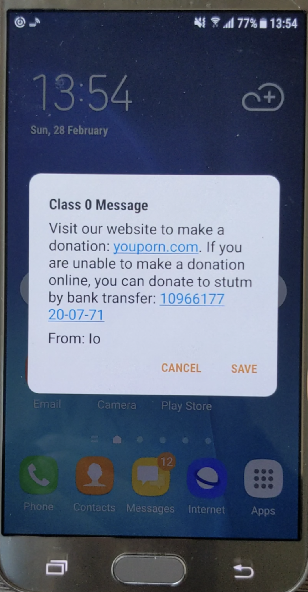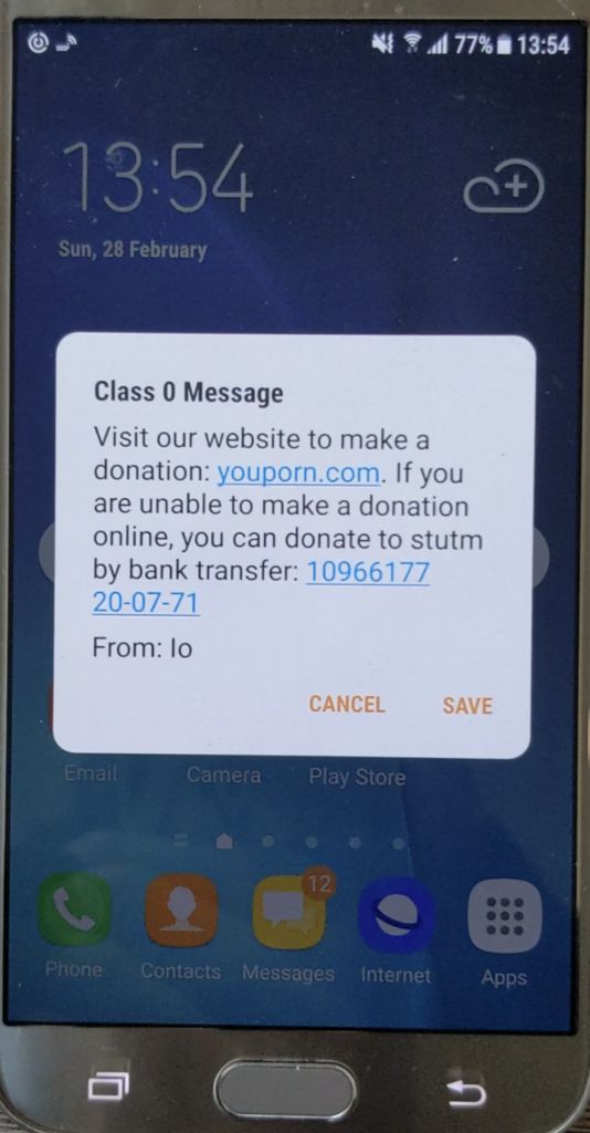 - Class 0: Using this class the SMS will appear on the receiver’s mobile screen and no user interaction is required. This SMS will be automatically deleted after a very short time (By default is 5 minutes but it could also be set to 0 seconds, resulting in an invisible SMS) unless the user decides to save it. To use this class, the Data Coding Scheme (TP-DCS) field must be set to