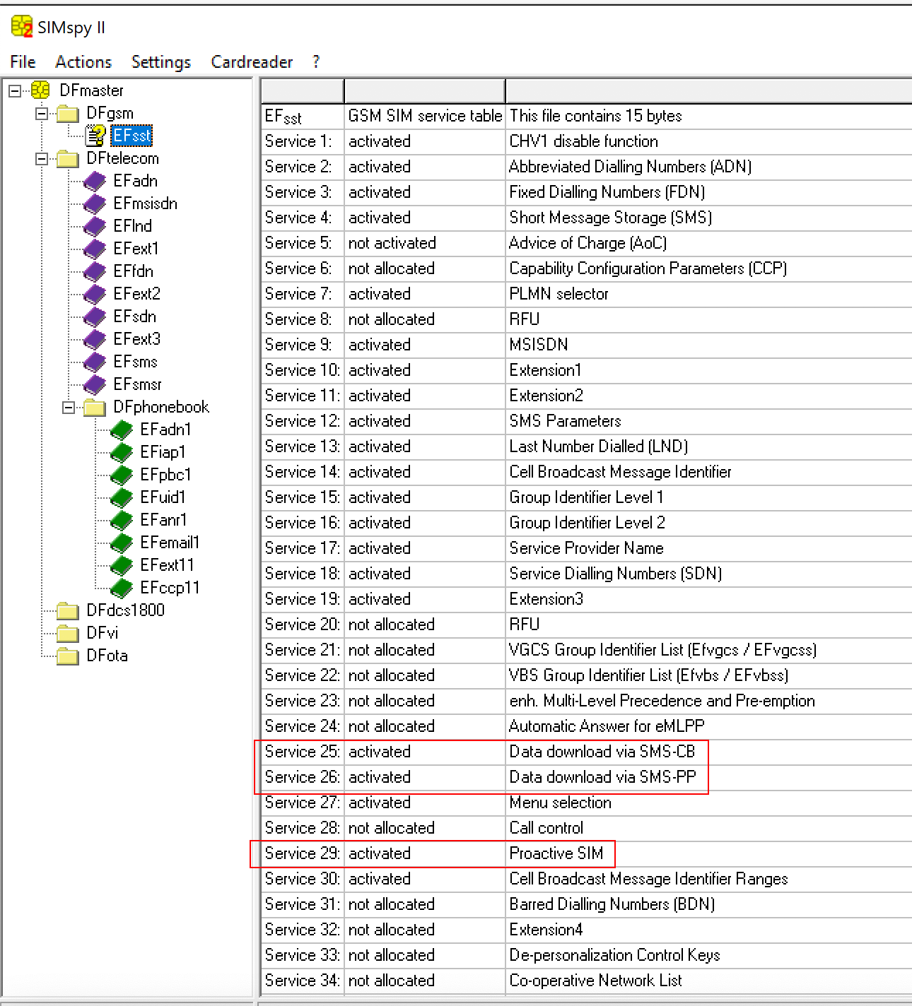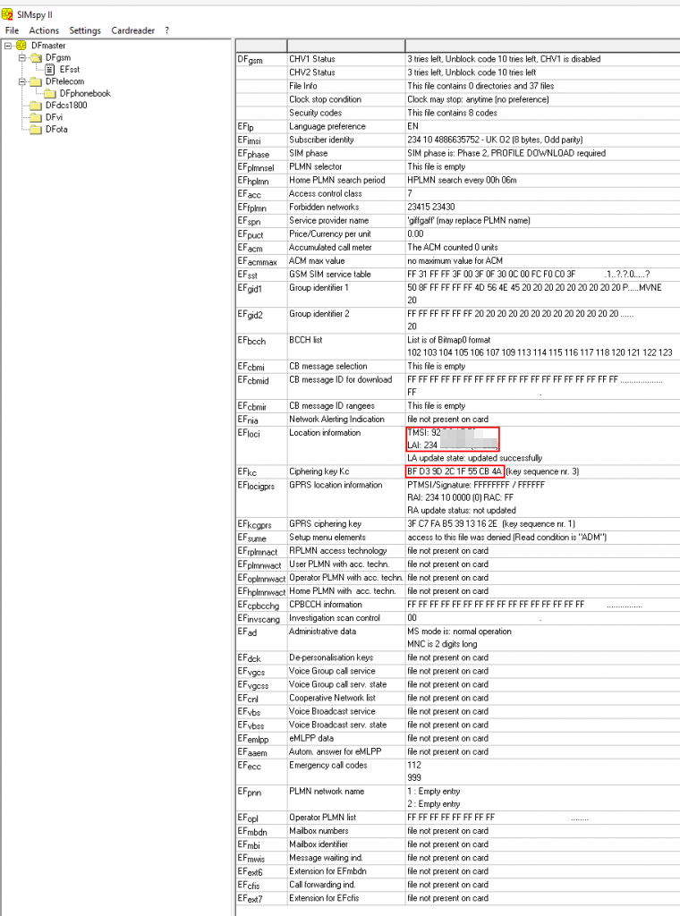 Being more interested in the content of a SIM card rather than its physical aspects, I analysed the content of a random one by using the PC/SC terminal Gemalto PC Twin Reader together with a forensic tool named SIMspy II. By checking the output returned by this tool, it was clear that information was stored in a directory structure.