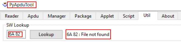 PyAPDUTool provides a useful utility that I used to parse part of the response data, that is a trailer of 2 bytes defined as SW1 (Status byte 1 – Command processing status) and SW2 (Status byte 2 – Command Processing Qualifier). The PyAPDUTool’ SW Lookup utility returns a reference message when using valid SW trailers and helped me to better understand what I was doing. For a non-valid SW trailer, the reference message returned was “Unknown Error”. Some examples of how the SW responses were interpreted by the PyAPDUTool’ SW Lookup utility can be found below.