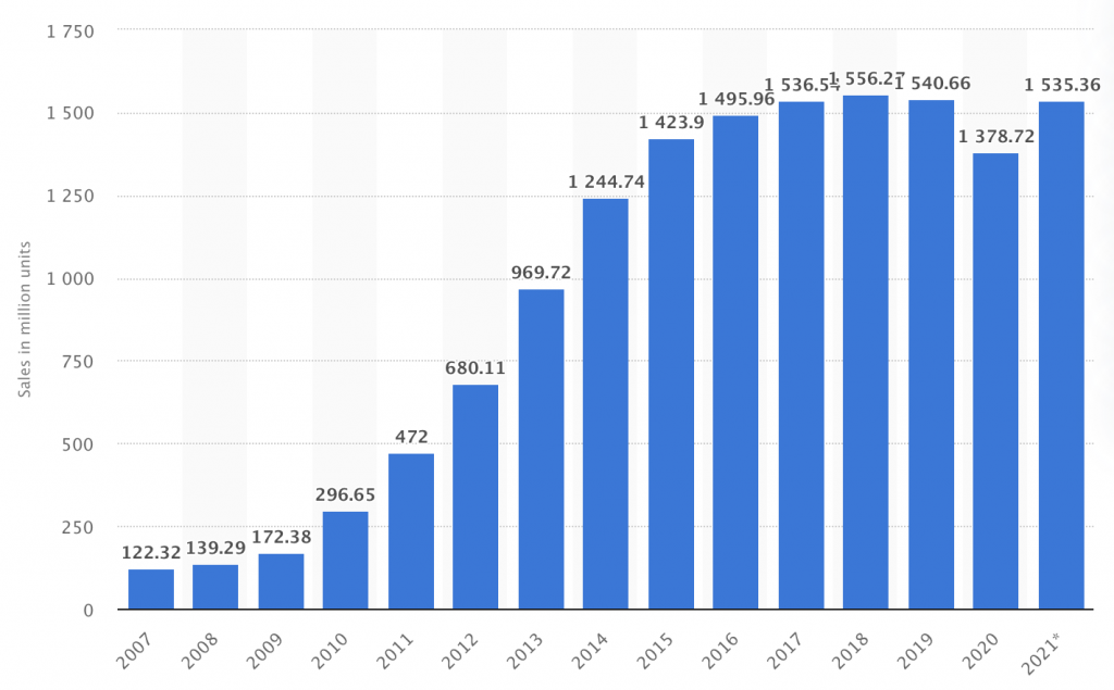 A SIM card (Subscriber Identification Module ), also known as UICC (Universal Integrated Circuit Card), is a little computer that, despite its dimension, permits very fast and efficient wireless communication between subscribers around the world. The below graph should be enough to give you an idea of how many SIM cards are used nowadays based on smartphone sales worldwide.