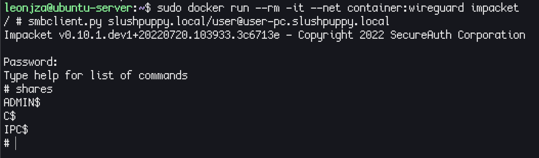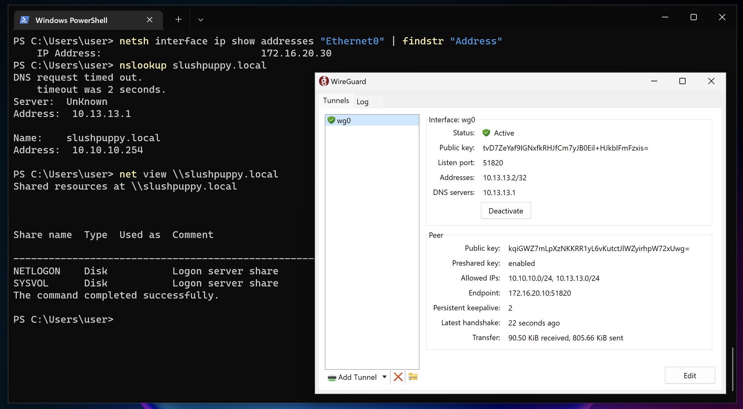 Using docker compose to glue the services together and to set this up quickly on a jump box, I gave it a test and was able to get SeatBelt.exe into the network from my own Windows VM just by connecting to the WireGuard VPN. \o/