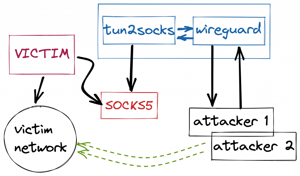 I built some infrastructure that you could deploy and use to easily tunnel from arbitrary sources over a proxy such as SOCKS, using anything that can run WireGuard. This is convenient in cases where it would be nicer to have a full network route to a target network (with working DNS) vs just having application specific proxy rules. In this post I’ll elaborate a bit on that idea. If you are just looking for the code you can find it here: https://github.com/sensepost/wiresocks.