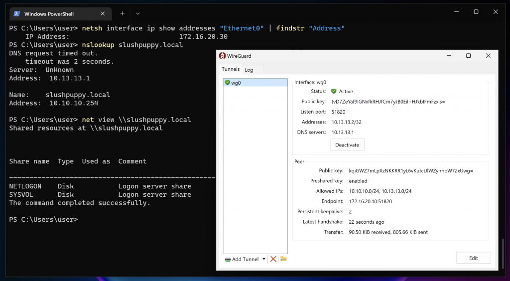 Using this setup, we can now interact with a remote network, using a traditional network route, complete with DNS resolution (more on that in a moment!).