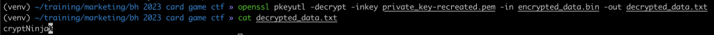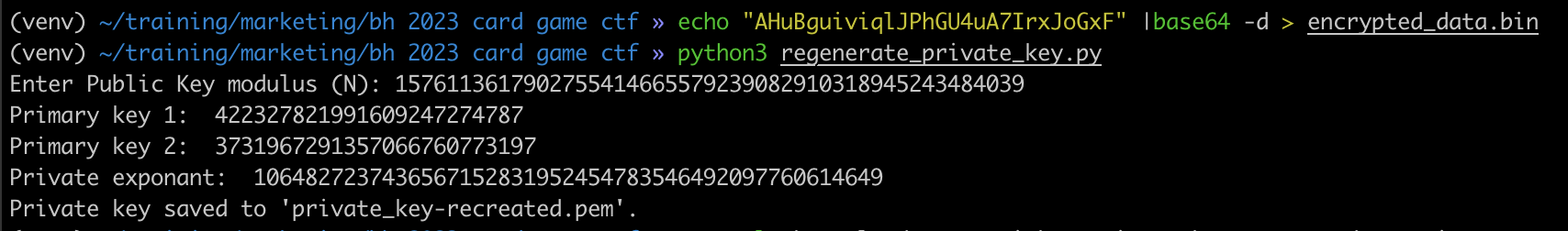 From there it’s as simple as recreating the decryption key and regenerating a private key to decrypt the garbage hidden in the base64 encoded string. Simplified how that’ll look: